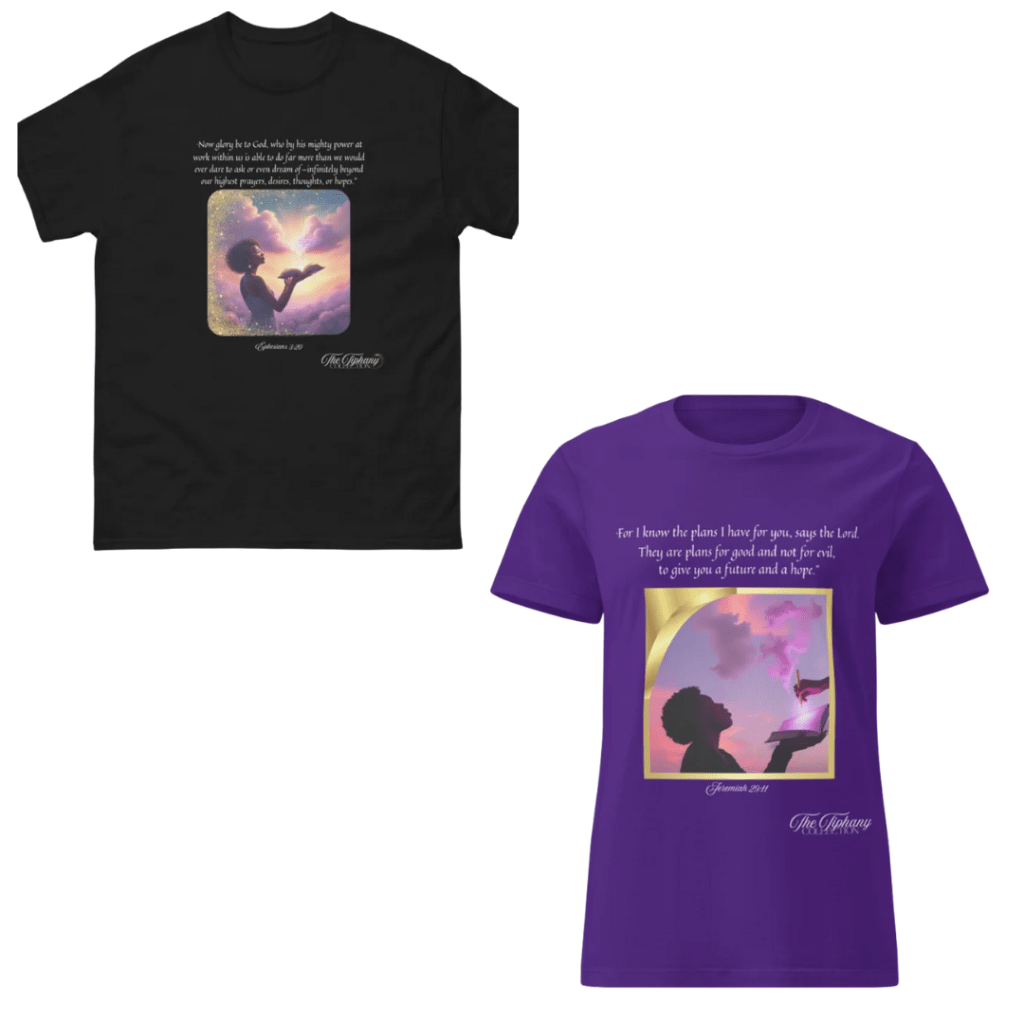 The name Tiffany means “manifestation of God” or “divine appearance.” The Tiphany (pronounced Tiffany) Collection is the manifestation of God’s Word on clothing and other items that can be seen and worn.
